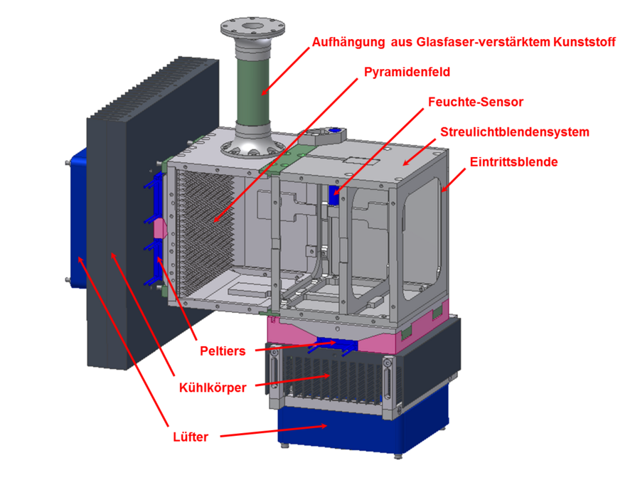 Das Gehäuse, das die optische Fläche umschließt, ist im vorderen Teil vom Pyramidenfeld thermisch entkoppelt und dient als Streulichtblendensystem. Es wird ebenfalls mit Peltierelementen gekühlt. Das Streulichtblendensystem wird bei einer etwas niedrigeren Temperatur betrieben und dient als Wasserdampffalle, um Kondensation auf der optischen Fläche zu vermeiden. Beide Schwarzkörper sind über eine GFK-Aufhängung mit der Instrumentenstruktur verbunden und mit einer Isolierung aus extrudiertem Polystyrol-Hartschaum versehen.