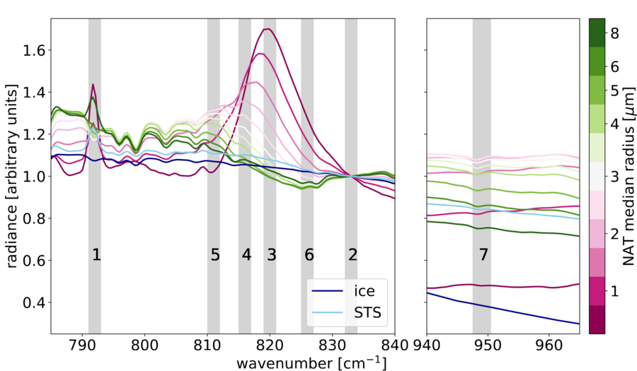 Figure 1: Spectral signatures of the different PSC particle types derived from simulations. Spectra simulated for NAT particles are shown in purple and green, spectra for STS in light blue, and spectra for ice in dark blue. The figure is taken from Kalicinsky et al. (2021).