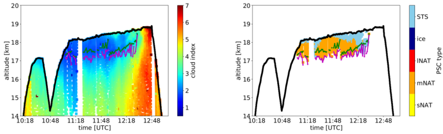 Figure 2: CRISTA-NF observation inside of the polar vortex during RECOCILE. The flight altitude is shown a black curve. left: Cloud index as a measure of optical thickness. Low values indicate clouds. right: Determination of the PSC particle types inside the cloud. The cloud bottom is located between the purple and the green curve. The figure is taken from Kalicinsky et al. (2021).