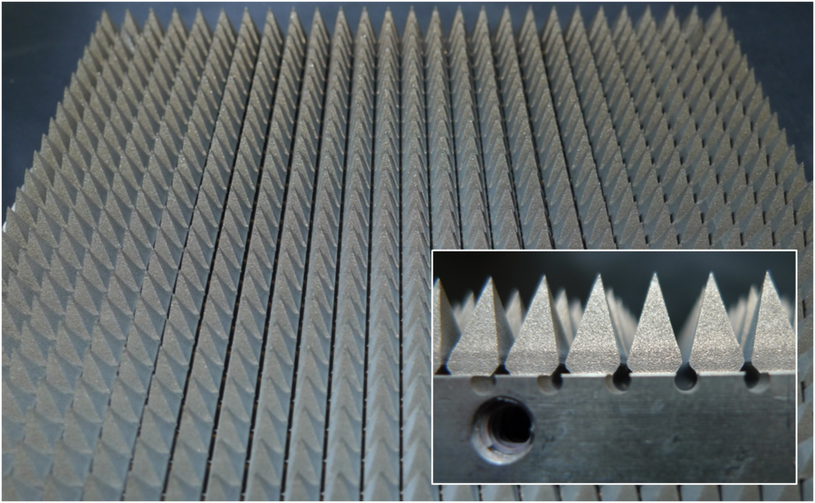 Sowohl das Pyramidenfeld als auch die Innenflächen des Gehäuses sind mit dem Schwarzlack NEXTEL-Velvet Coating 811-21 beschichtet, der einen Emissionsgrad von mehr als 0,967 im Wellenlängenbereich von 5 bis 12 μm besitzt. Aufgrund der steilen Flanken der Pyramiden wird der Großteil der einfallenden Strahlung nach hinten reflektiert und so die Absorption erhöht. Für den Strahlungsaustauch des Pyramiden-feldes mit der Apertur-Fläche wurden Geometriefaktoren bestimmt und daraus ein effektiver Emissionsgrad von 0,9996 ermittelt. Die gemessene Unsicherheit der Beschichtung von 1% führt zu einer Unsicherheit im Emissionsgrad von u(ε) = 0,0003.