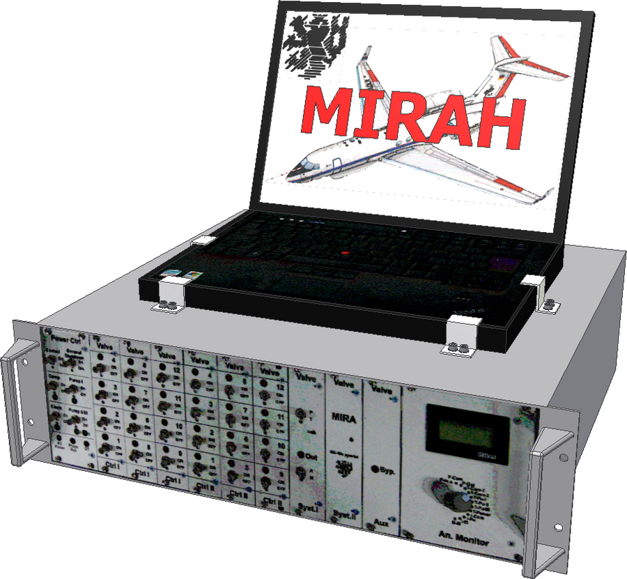 MIRAH is a stand-alone system, operating at 115V / 200V, 400Hz, 3 phases. The system is controlled via a mobile laptop. It is integrated in two R-228 T-racks (DLR, Oberpfaffenhofen) in the HALO luggage compartment. The MIRAH-Rack-1 contains the two container modules, each with 12 sampling containers. The compressor unit, the diaphragm pump insert, the RPDB_AC and the electronics module are located in MIRAH-Rack-2.