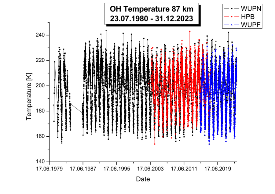 The Wuppertal GRound-based Infrared P-Branch Spectrometer (GRIPS) instruments have measured the temperature of the mesopause region at an altitude of about 87 km in "every" night since 1980. You can find the corresponding press article here. More than 10000 nightly mean temperatures are available for all instruments together.